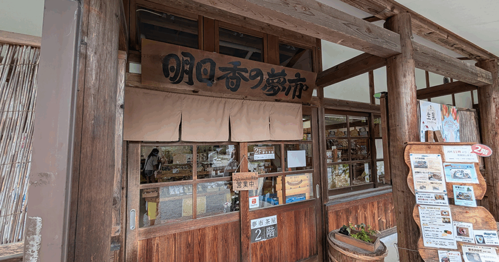 明日香の夢市と併設される夢市茶屋は、明日香村の中心部からやや南に位置する道の駅的な施設です。国道169号線沿いにあるため、車でのアクセスが便利で、駐車場も十分な台数が確保されています。